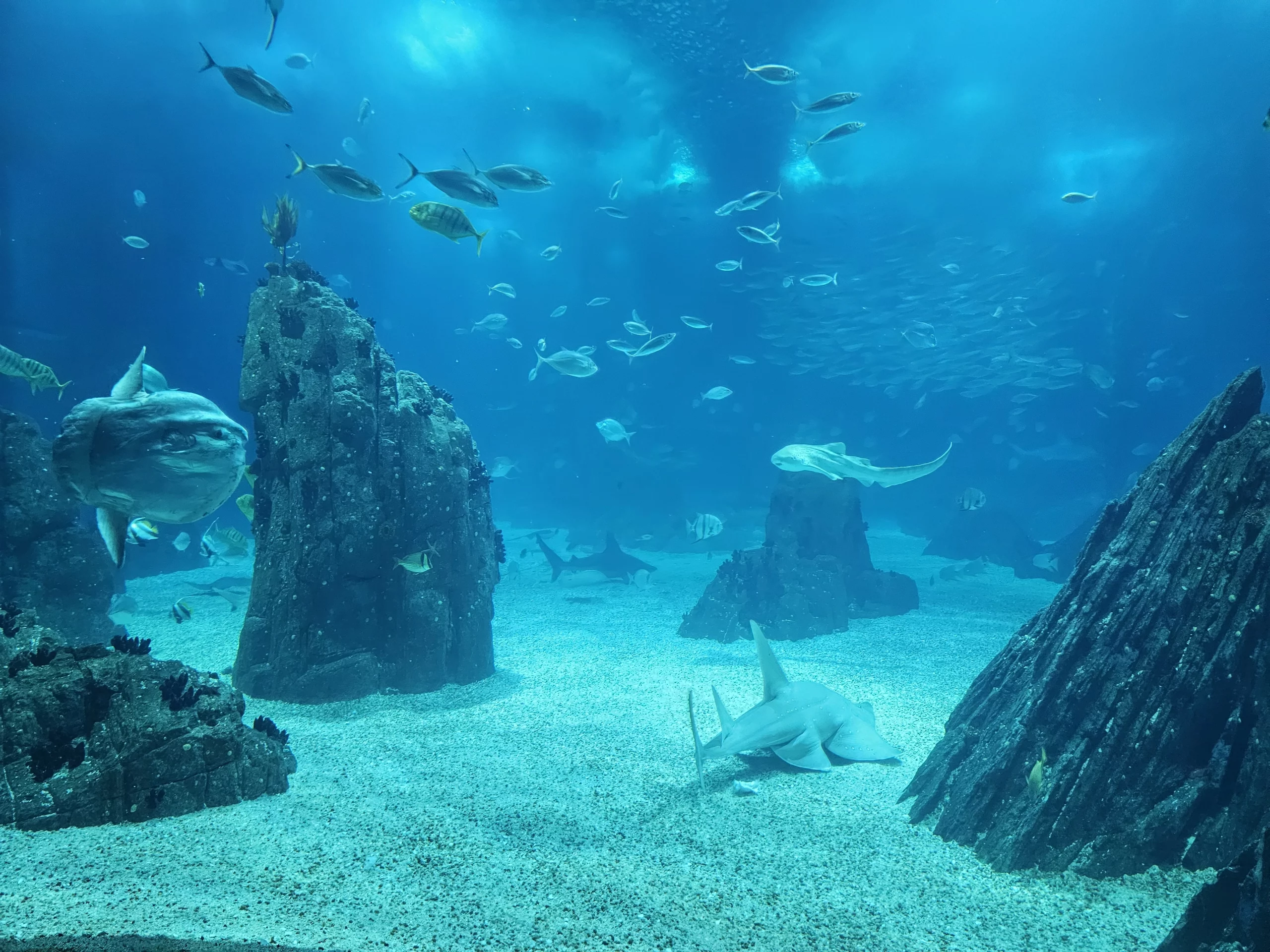 The imposing central aquarium, holding 5 million liters, represents the world’s oceans and is home to over 500 species, including sharks (such as sandbar sharks, zebra sharks, and whitetip reef sharks), rays (bull rays, violet ray and devil rays), sunfish, barracudas, garibaldi and clownfish.