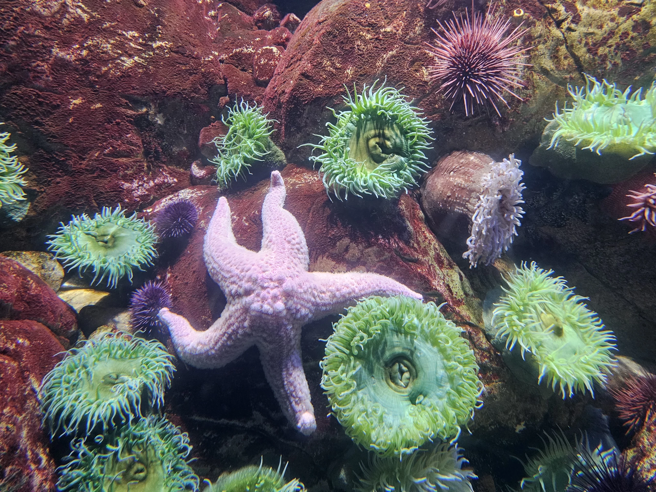 It is surrounded by four distinct marine habitats —North Atlantic (Azores coast), Antarctic, Temperate Pacific (rocky shores), and Tropical Indian (coral reef)—creating the illusion of a single ocean.